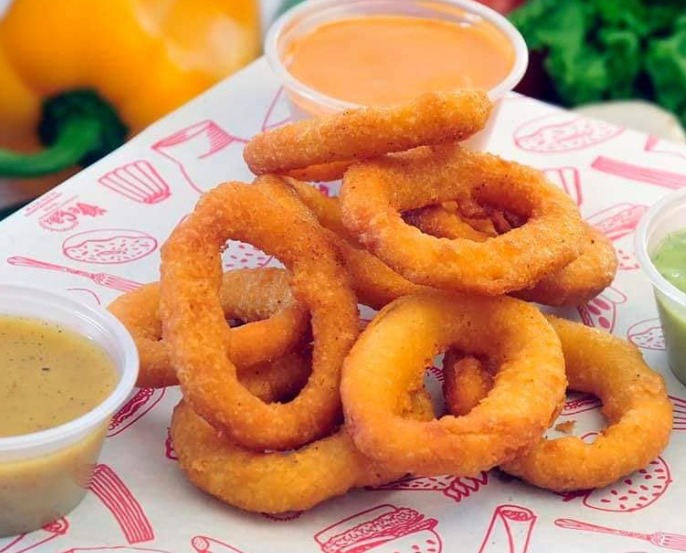 6 Deliciosos aros de cebolla, acompañados de una cama de papas fritas bañadas en ranch apios y zanahorias.