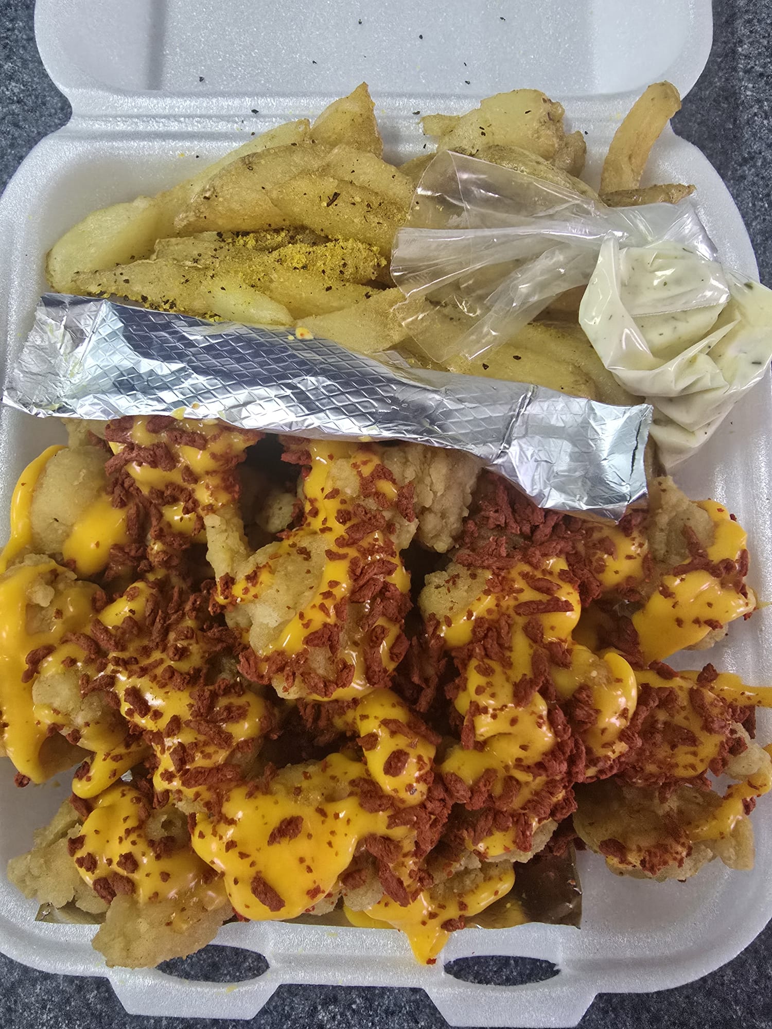 Papas a la francesa con queso nachos.