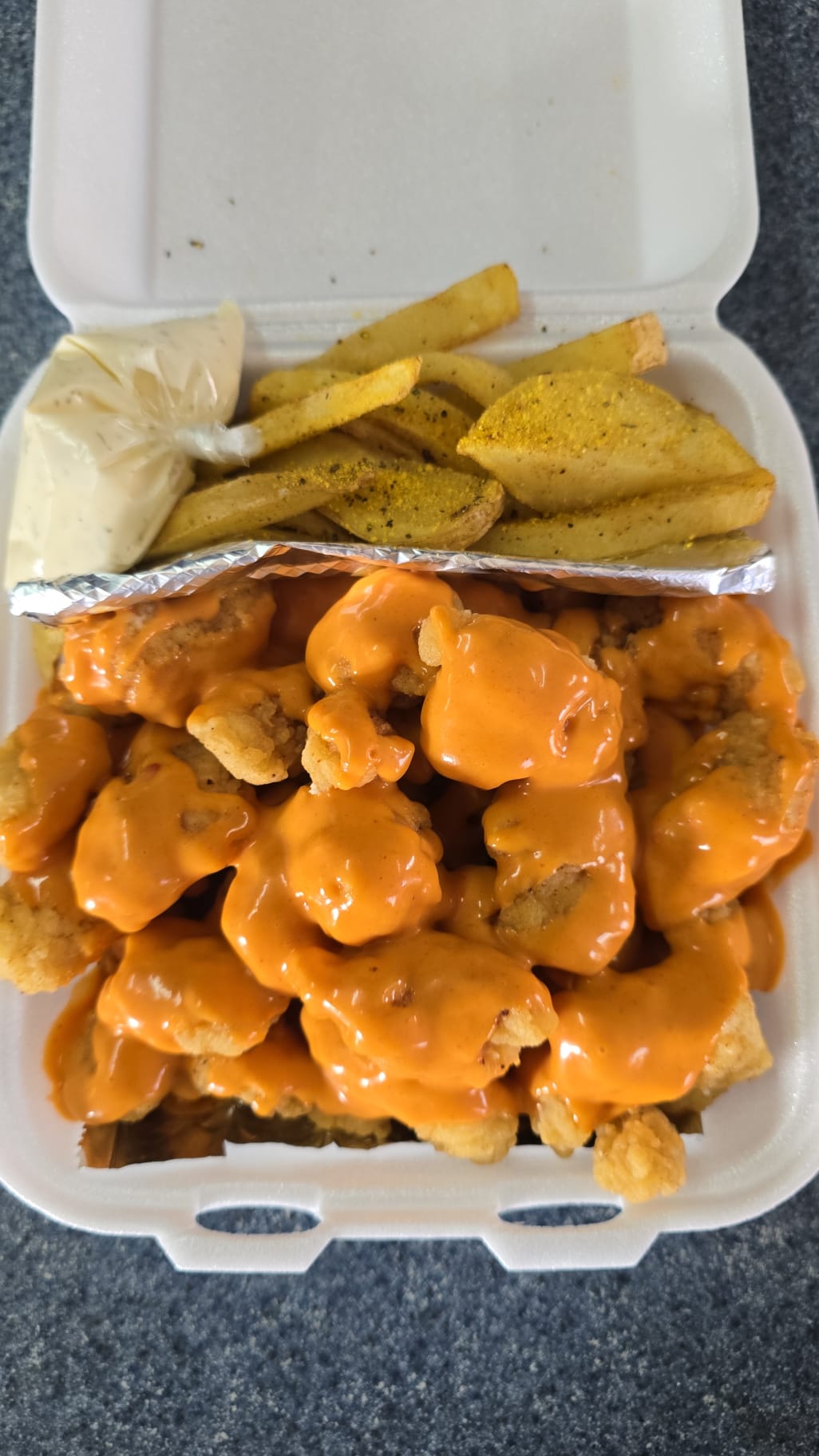 1kl de boneles 100% pechuga de pollo 😋🐔 bañados en una deliciosa salsa de queso 🧀con jalapeño cremosa papás 🍟y aderezo ranch 😋