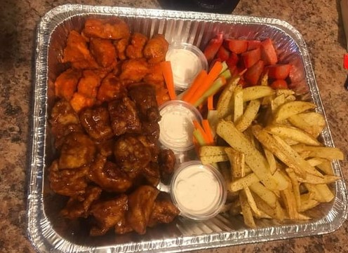 Medio kilo de boneless medio kilo de alitas bañados en salsa que tú gustes 2 aros de cebolla 2 polera 2 dedos de keso papas fritas con lemon pepper jícamas, apios, zanahorias y aderezó blue cheese.