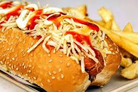 Hot Dog Polaco ahumada acompañado con queso nacho y tocino, aderezo y cebolla y tomate.