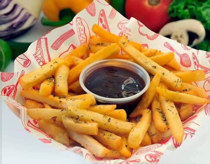 Papas a la francesa, bañados en blue cheese y perejil deshidratado.