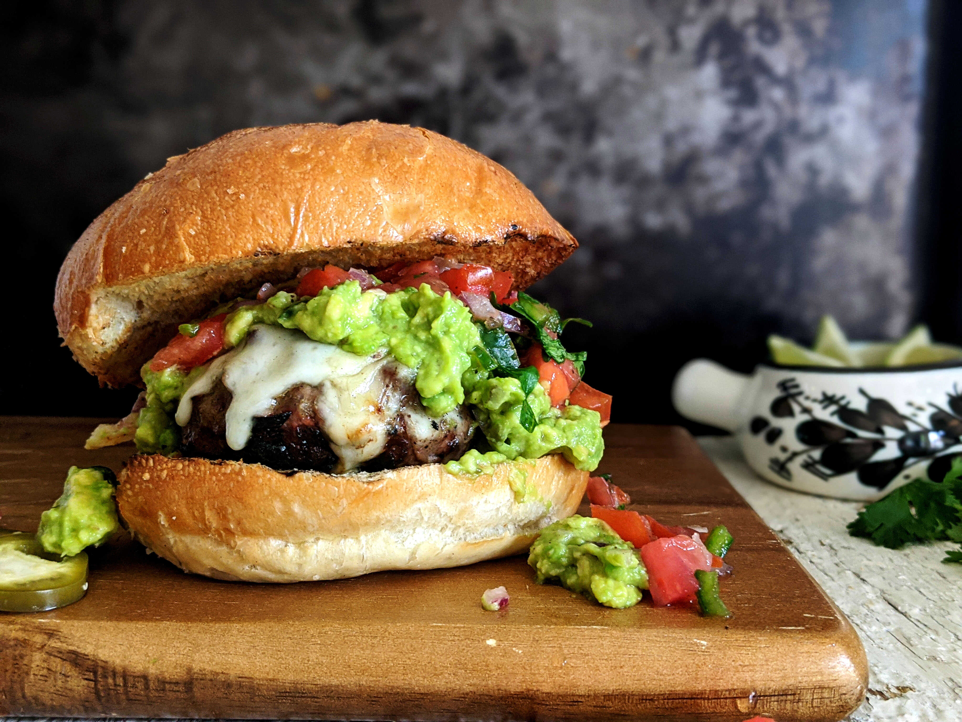 Deliciosa carne de res, acompañada de mucho guacamole casero, jamón de pavo , queso americano, acompañada de papas fritas con lemon pepper, aderezos y verduras.