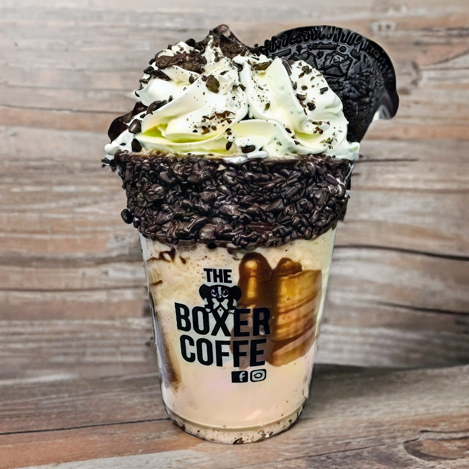 Nuestro frappe Coockies & Cream acompañado de una Sandwish de Galleta oreo gigante. La presentacion del frappe puede variar al ser envio a domicilio y diferir al que entregamos en el local.