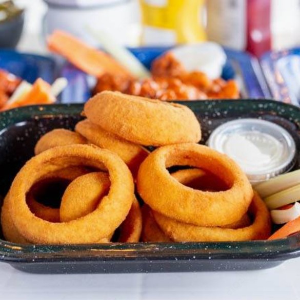 Los que no pueden faltar. Crujientes aros de cebolla empanizada, acompañados de nuestra salsa de tomate.
