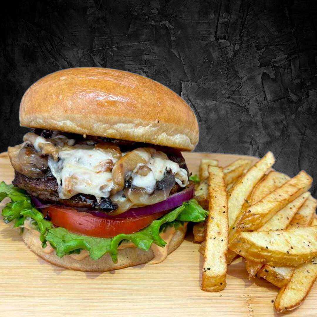 Pan Brioche, Carne, queso americano, aderezo, champiñones, Cebolla