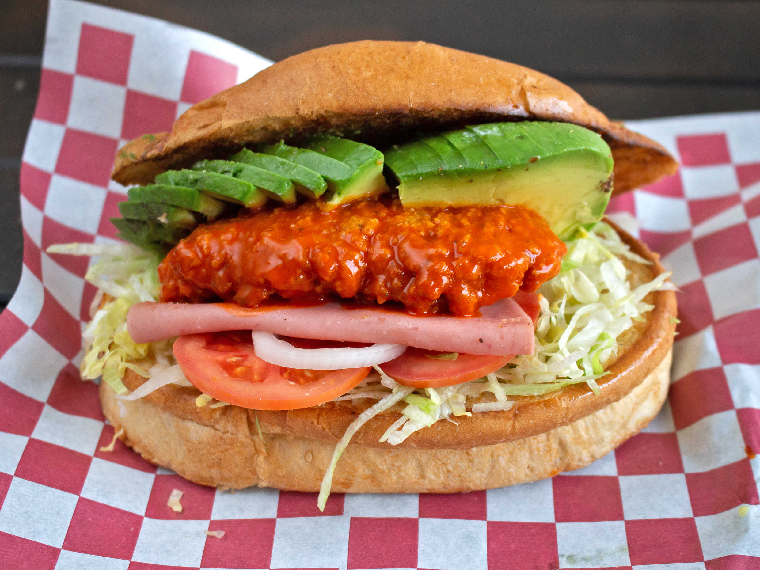 Pechuga de pollo empanizada y bañada en salsa bufalo spicy, pan brioche hecho en horno de leña,tocino, queso de la casa, tomate, lechuga, aderezo ranch