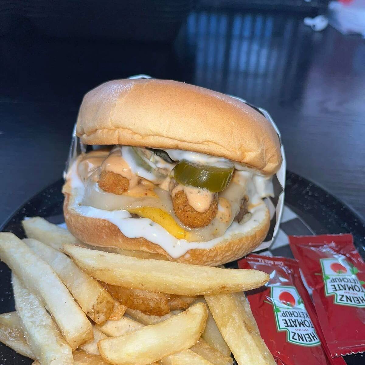 Carne de de sirloin 150 g queso americano, queso chihuahua, 3 dedos de queso, jalapeños, aderezo chipotle y pan brioche.