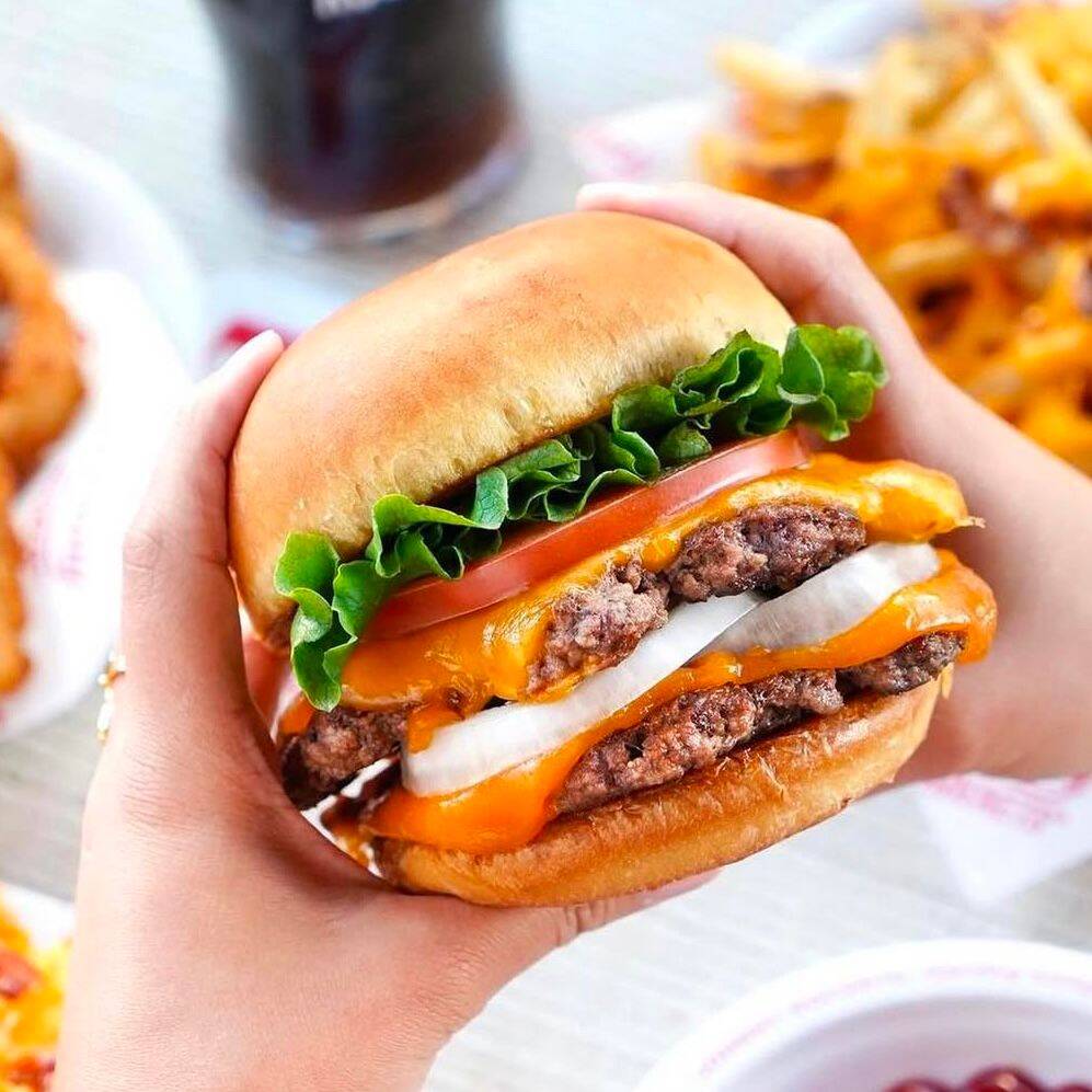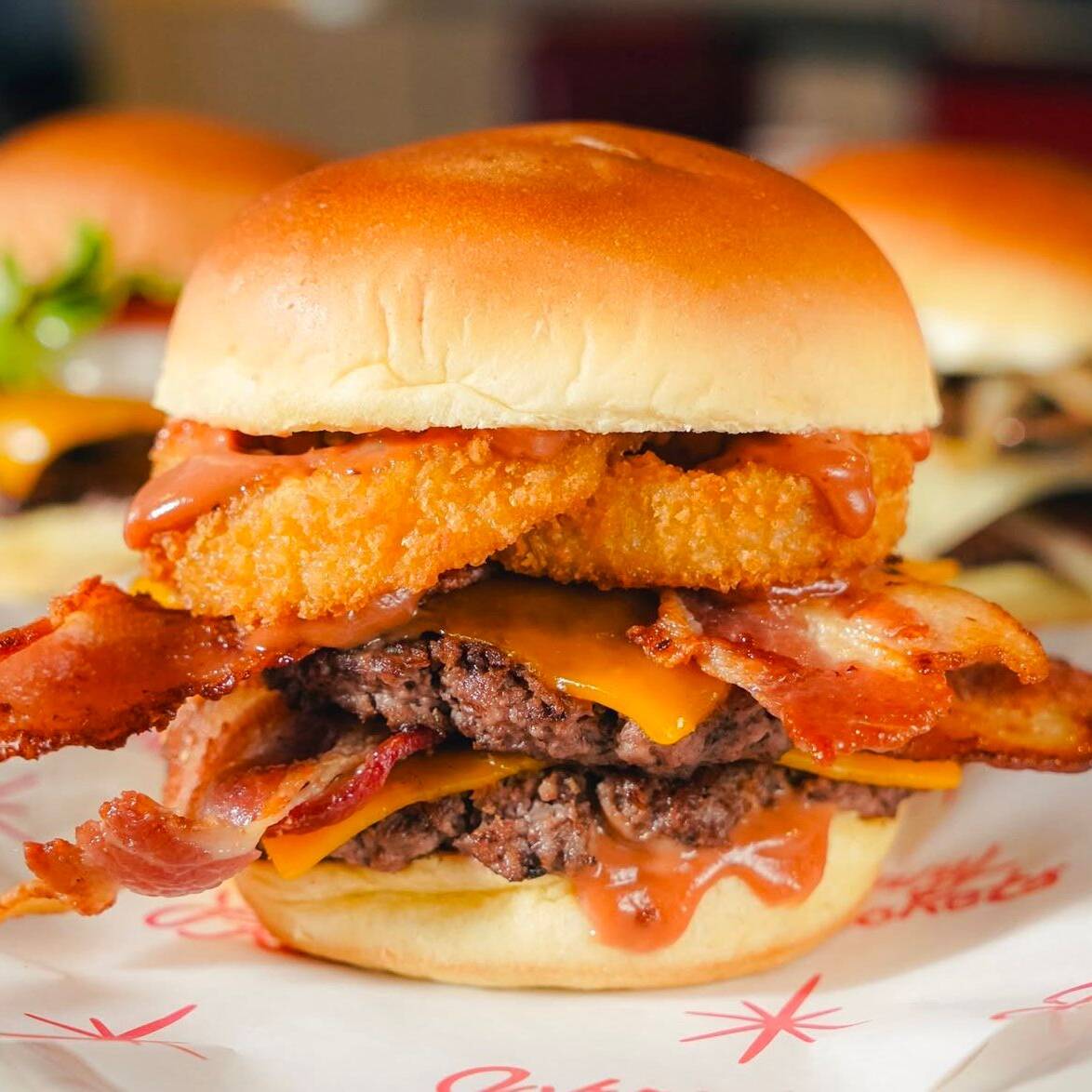 Carne de sirloin 150 g con queso, tocino, 2 aros de cebolla, aderezo BBQ y pan brioche.