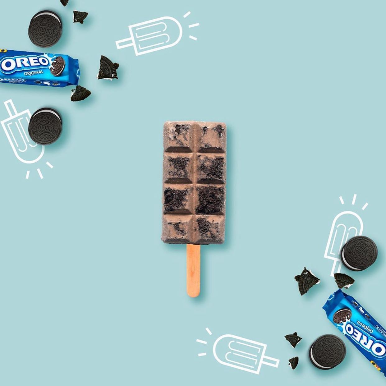 Sándwich de galleta, relleno de helado de vainilla, y cubierto con chocolate.