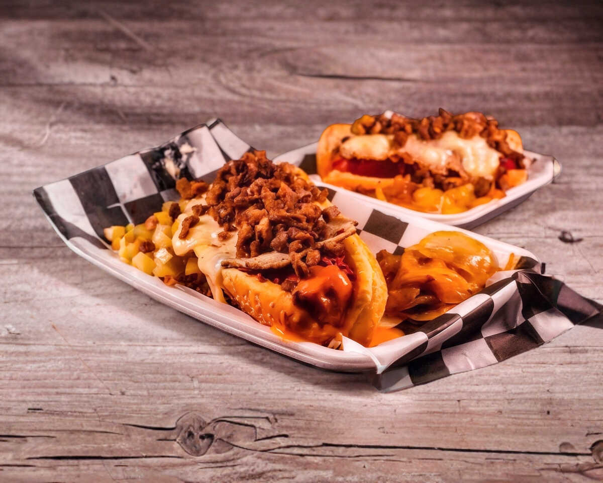 2 hot dogs de salchicha p/asar y 3 tradicionales, complementos a elección acompañados de papas doradas y cebolla caramelizada..