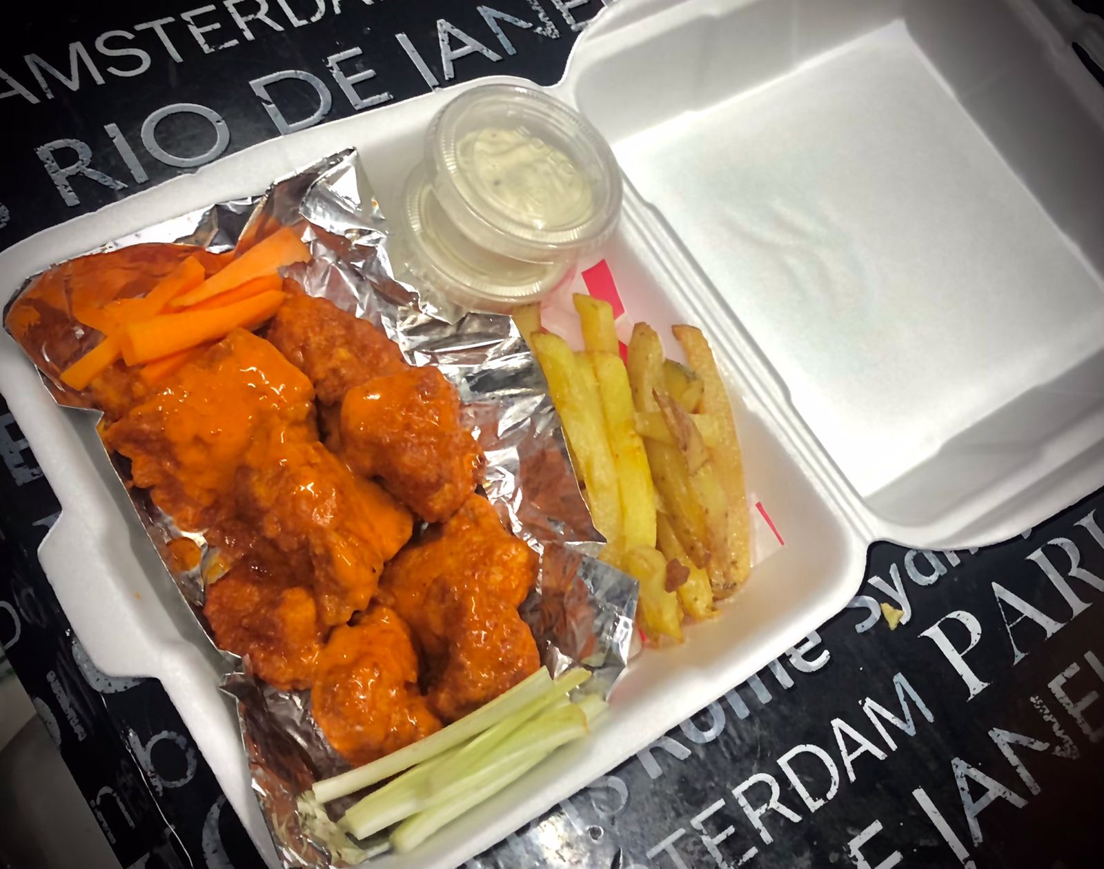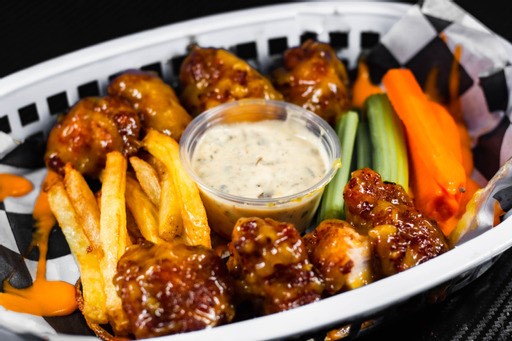 Orden de 700 gr de boneless acompañados de papas a la francesa, aderezo ranch y verduras.