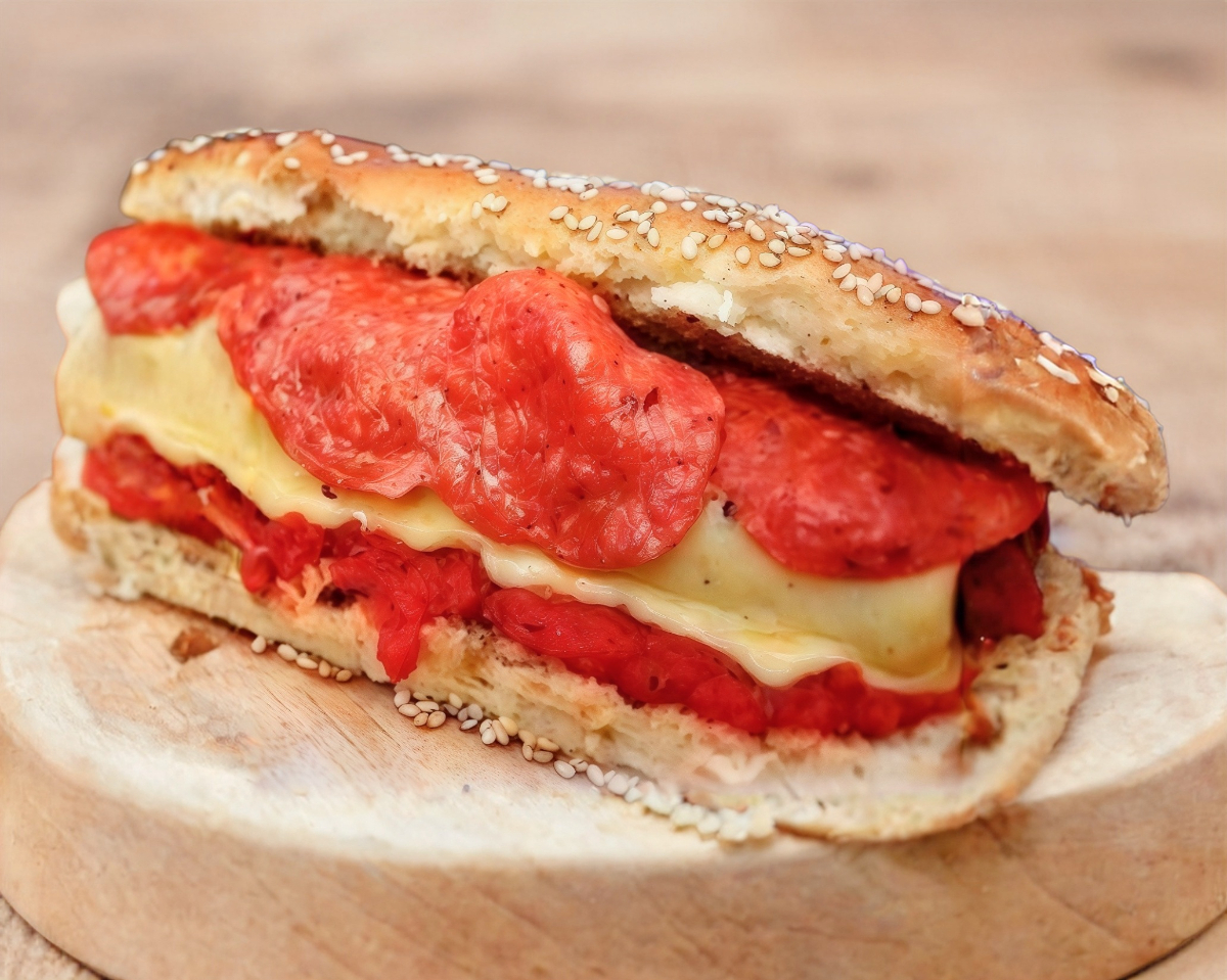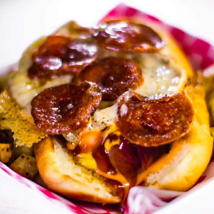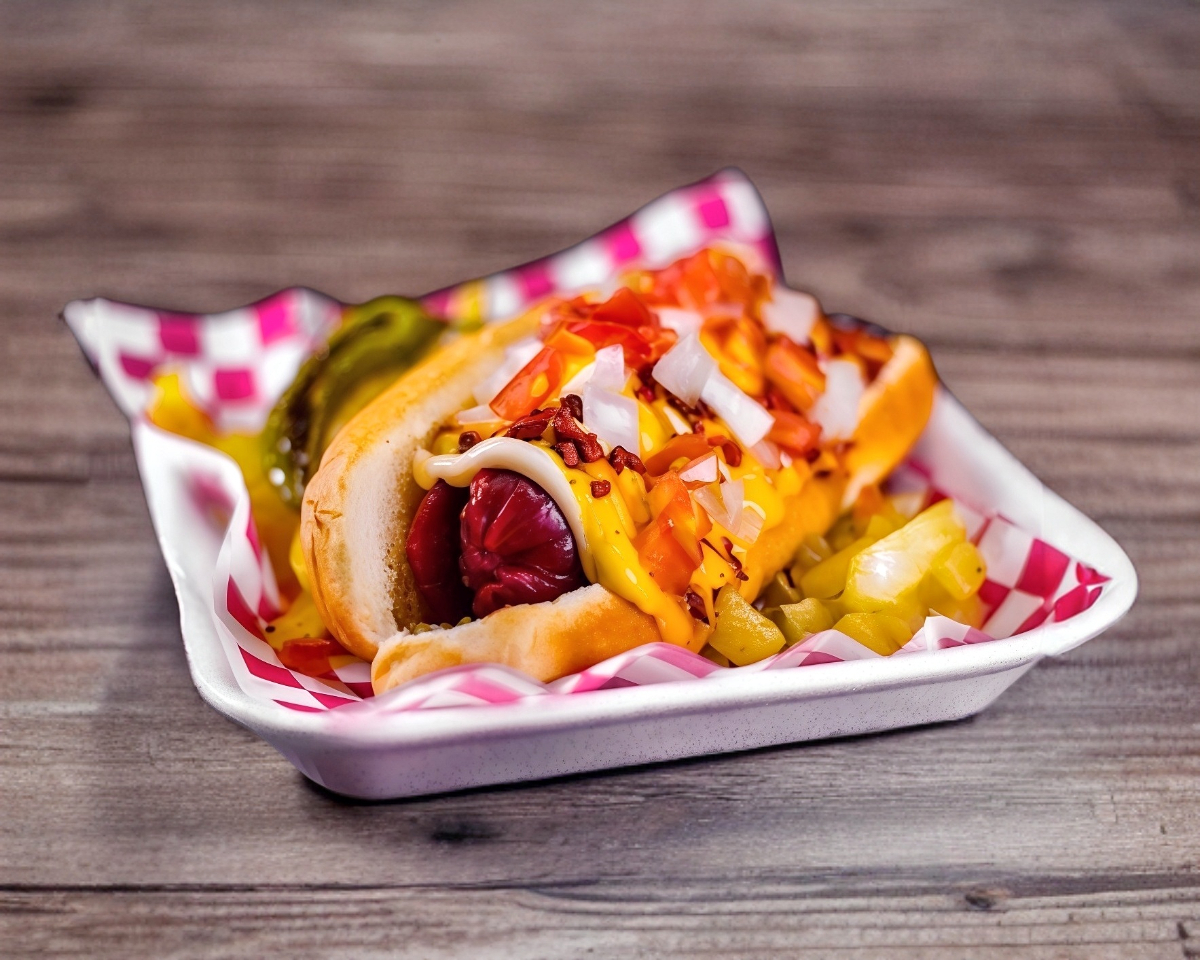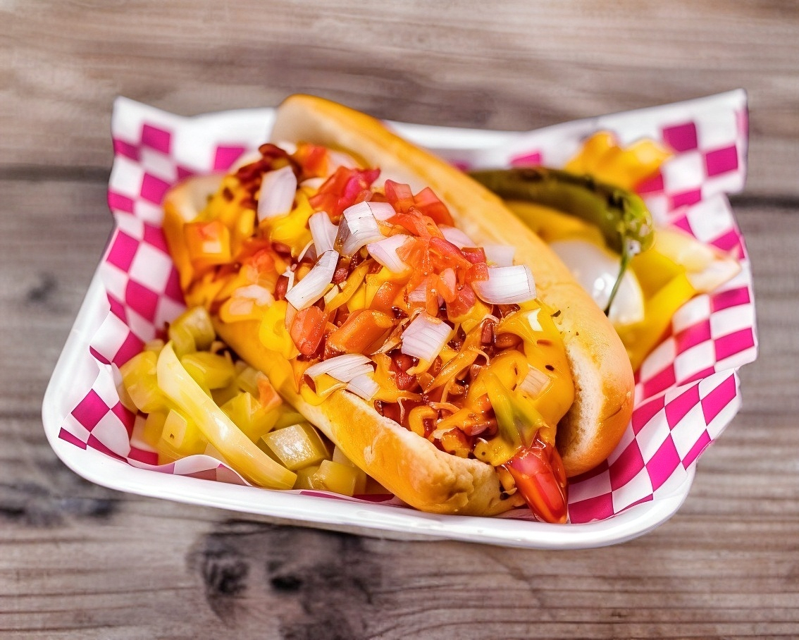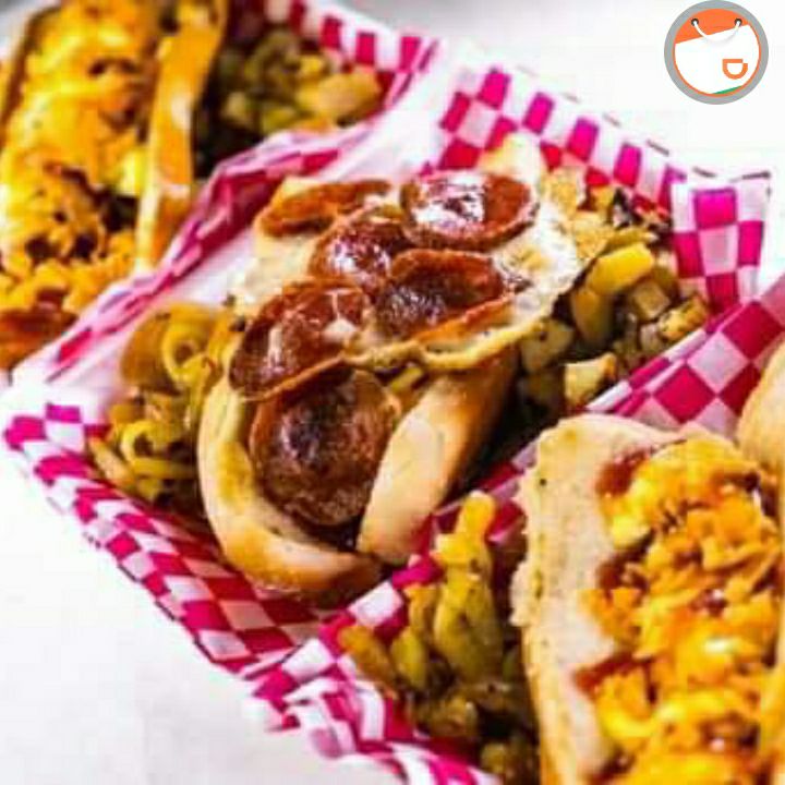 Delicioso hot dog de asar, con una cama de queso gratinado con pepperoni papas doradas, cebolla caramelizada y complementos a elección.