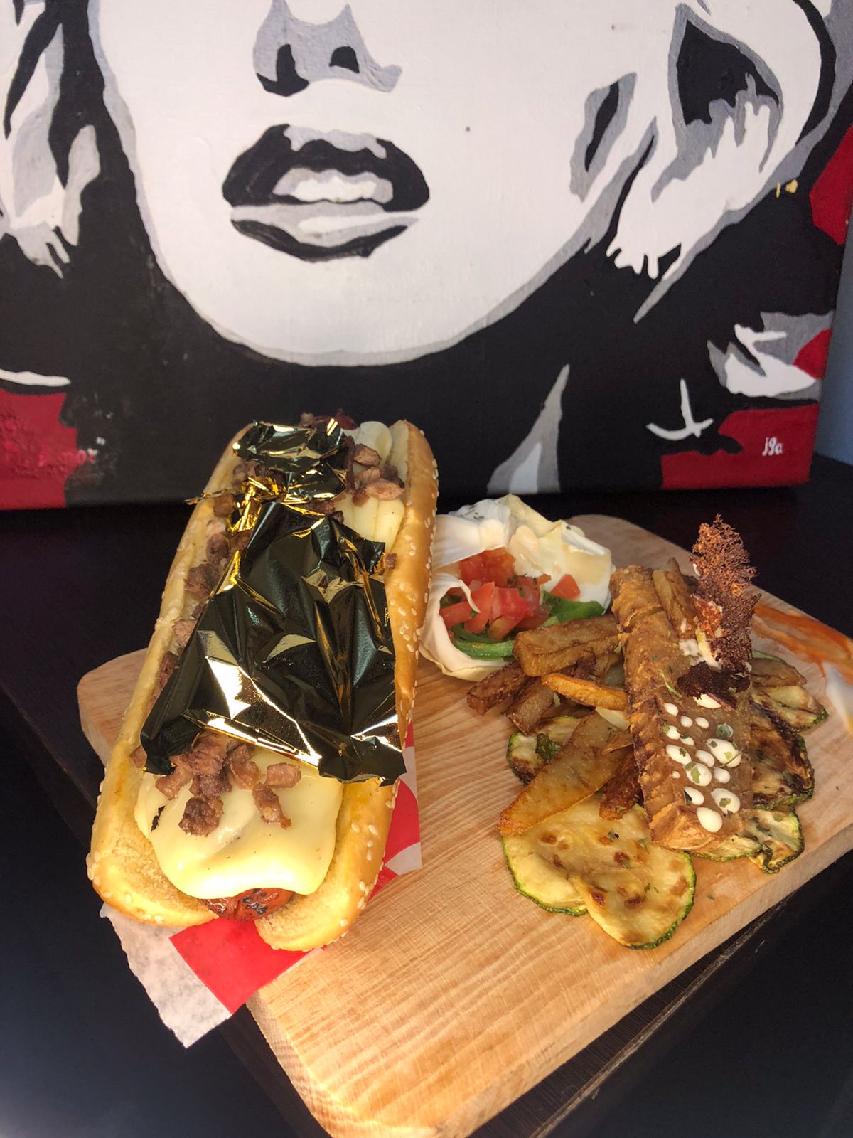Hot dog de salchicha polaca con queso gratinado, pepinillos, aros de cebolla y papas a la francesa.