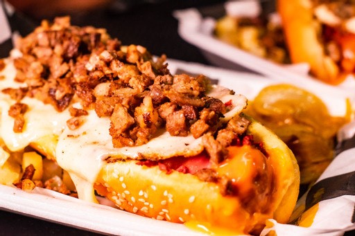 Hot dog de s/ asar con una cobertura de queso asadero y carne asada + cebolla caramelizada y papas.