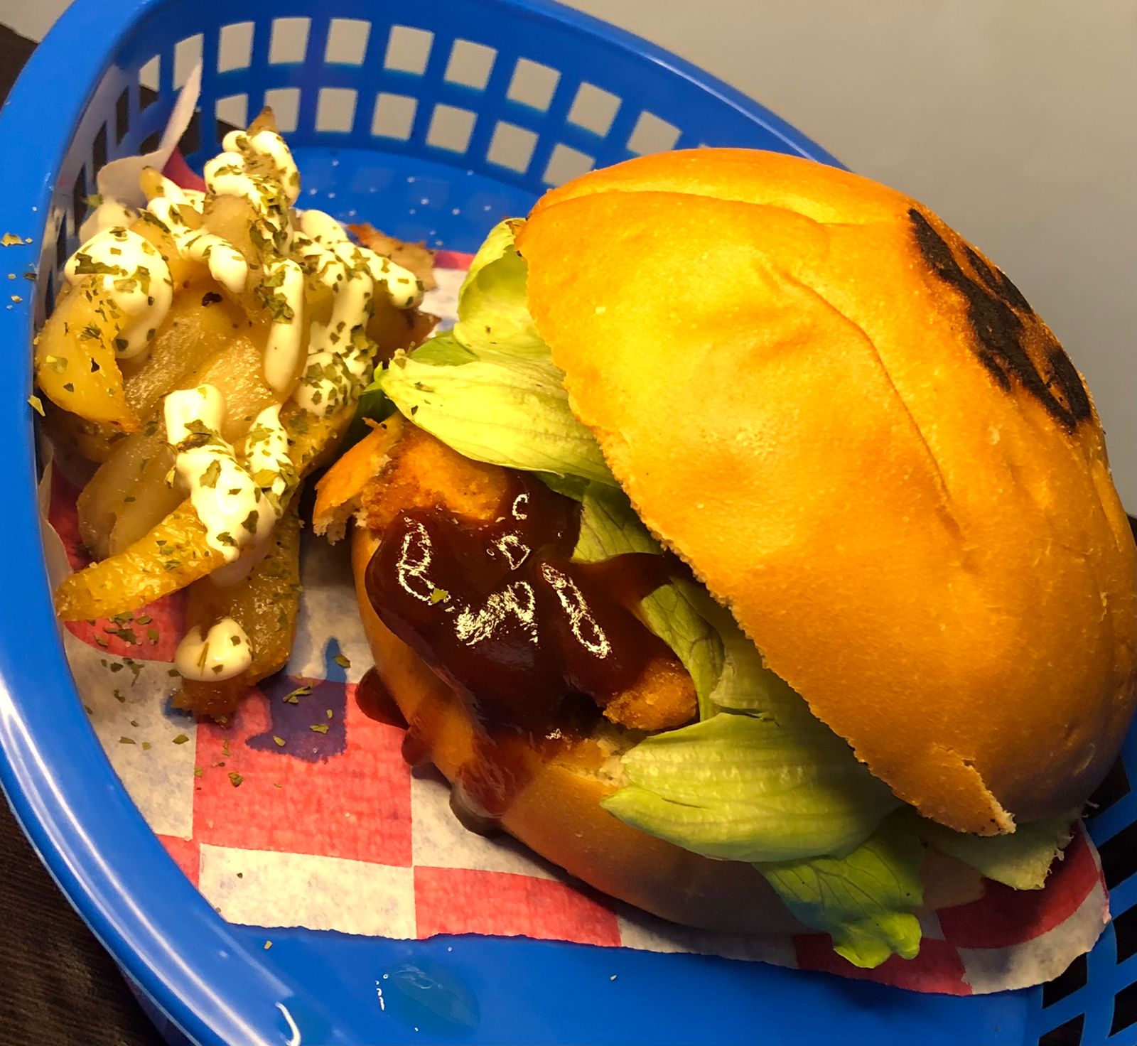 Hamburguesa de pollo con queso bañada en salsa BBQ acompañado de complementos a elección.
