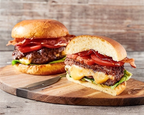 Hamburguesa sencilla, carne de res 100% casera, tocino, queso americano, aderezos de la casa, lechuga, tomate y cebolla.