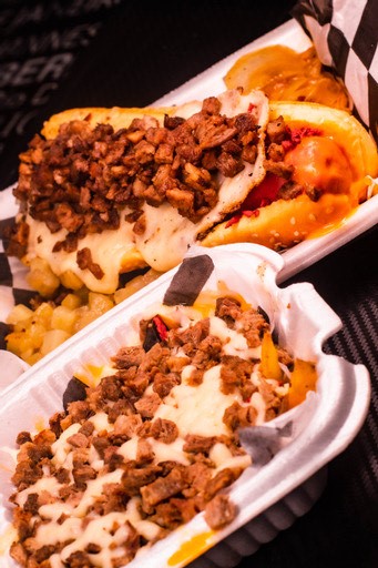 (200 gr) de papas a la francesa con una cobertura de queso manchego y carne de sirloin.