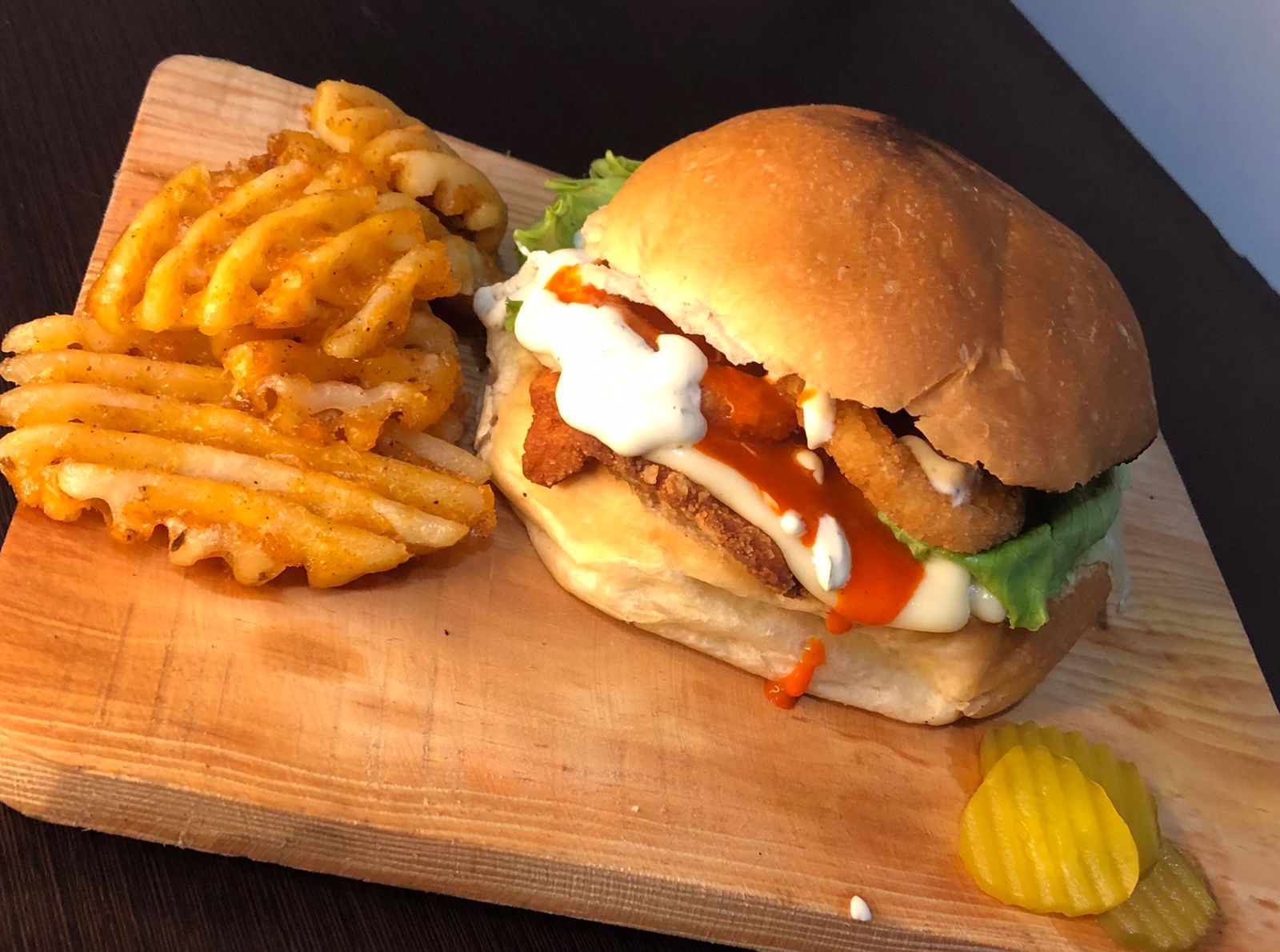 (Pan brioche, pollo, lechuga, aderezo de la casa, salsa búfalo y quesos con papas a la francesa)