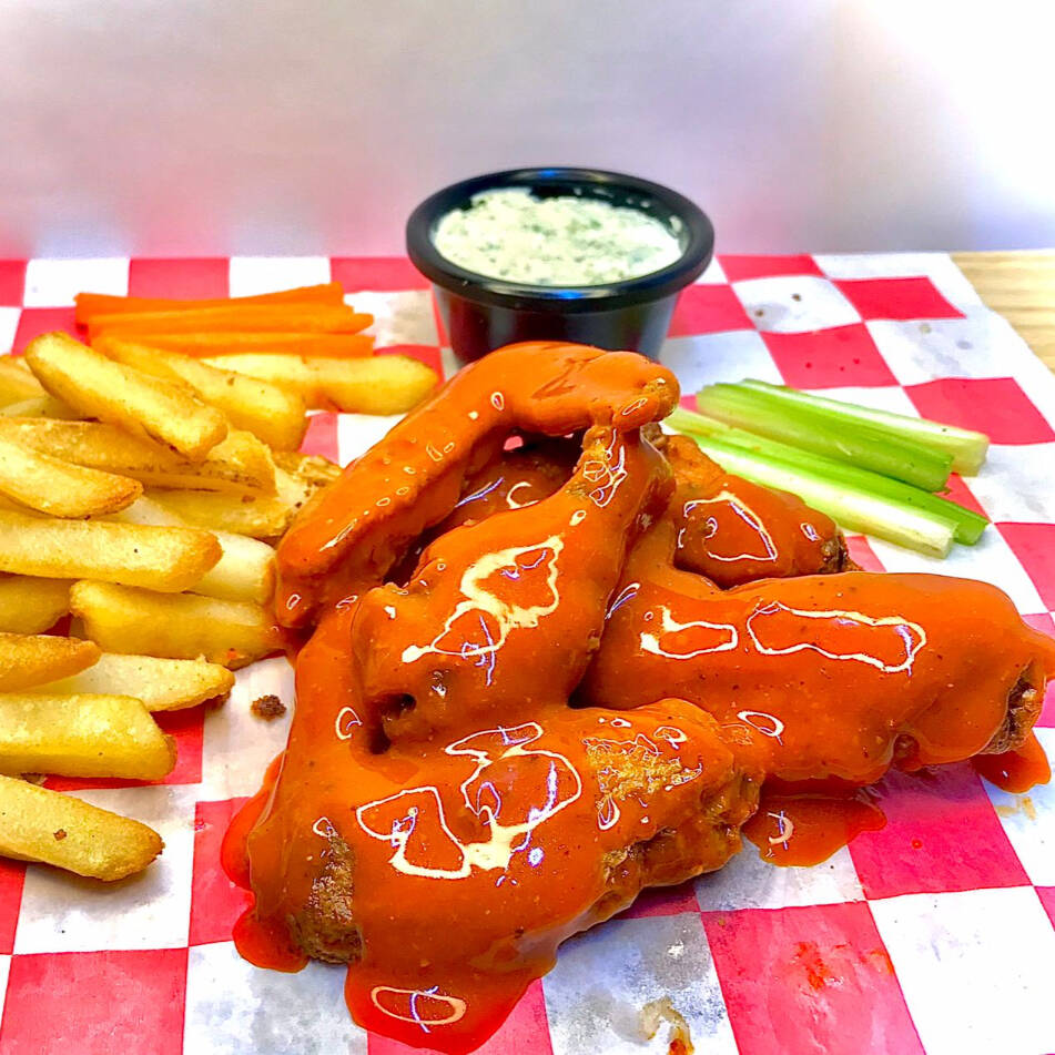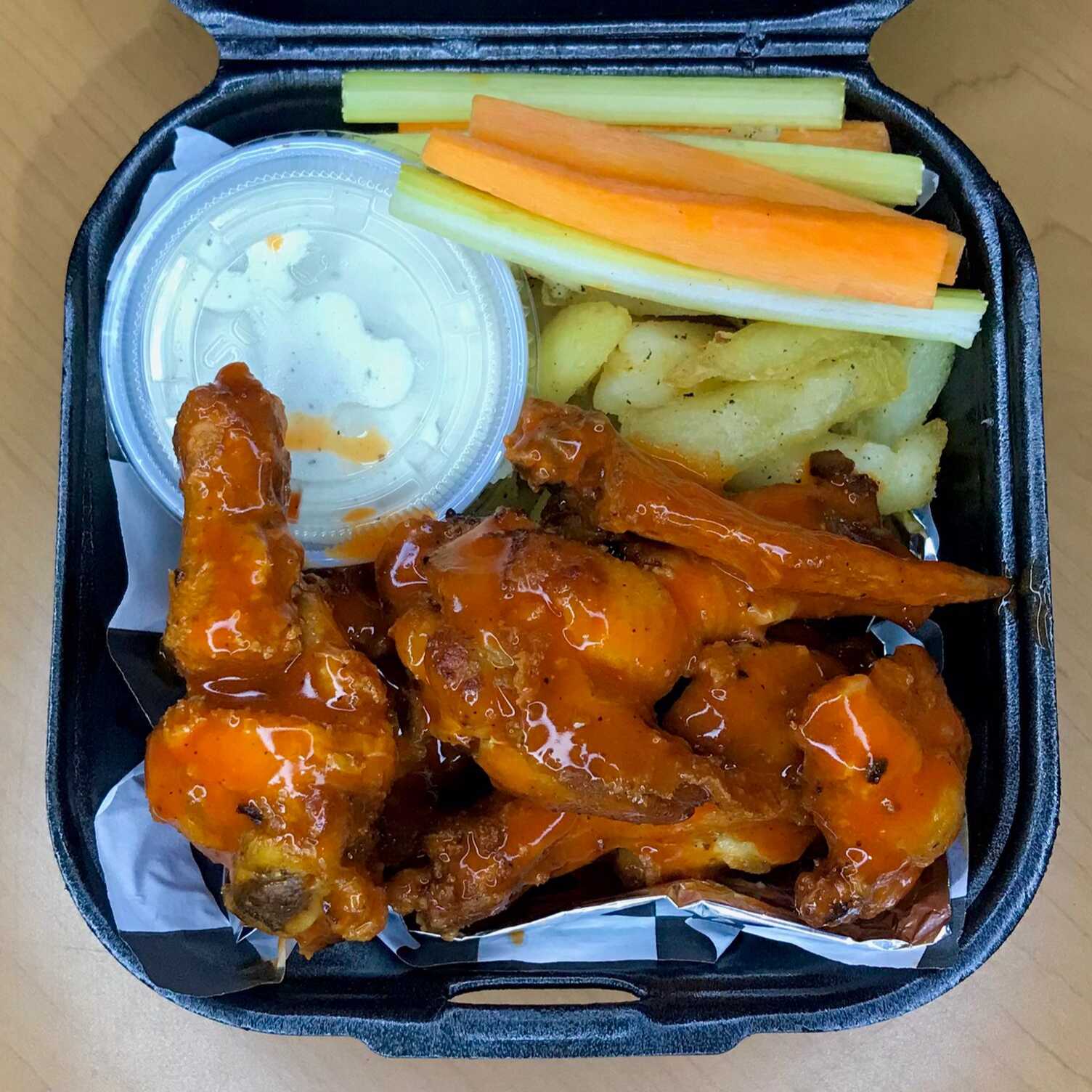5 alitas aprox con papas a la francesa, apio, zanahoria y aderezo ranch.