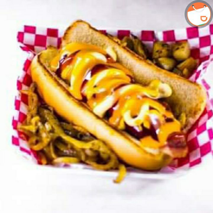 Salchicha Polaca estilo Jumbo, cebolla caramelizada, papas doradas y complementos a elección..