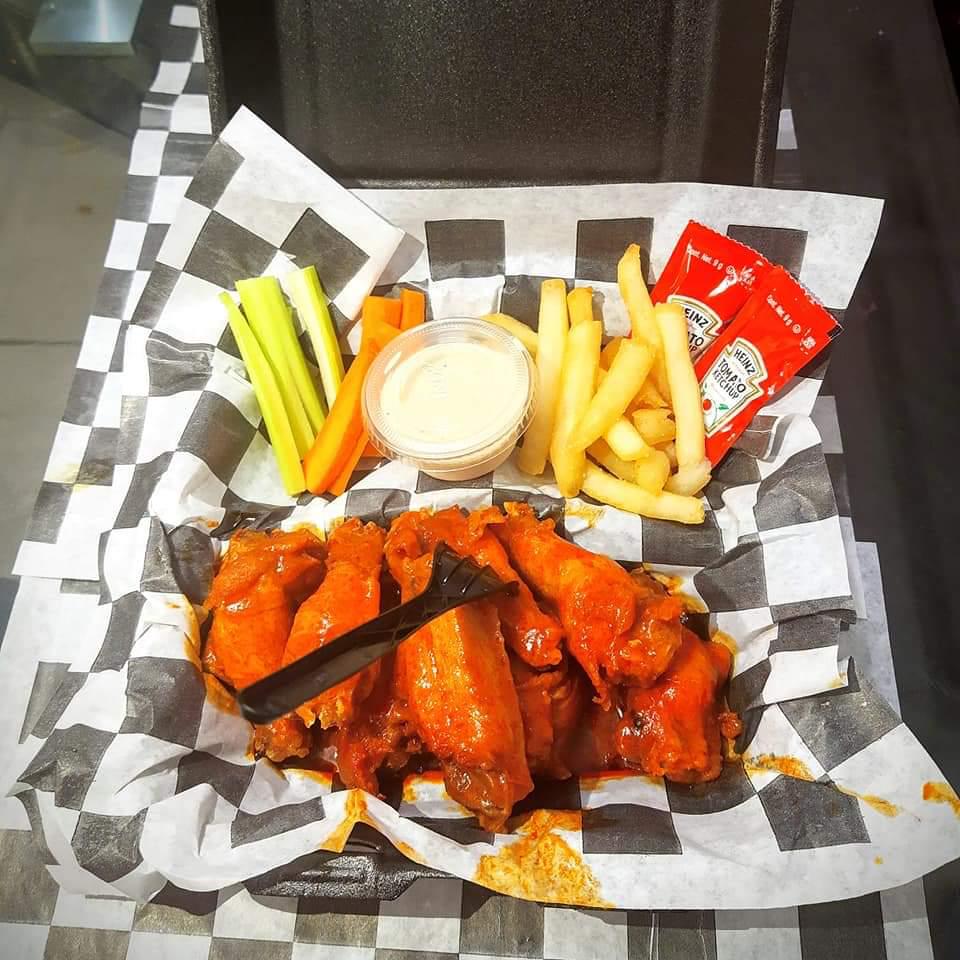 Orden (6pz) de alitas naturales bañadas en salsa búfalo, bbq o mango habanero, mixtas o naturales, acompañadas de apio , zanahoria y papas a la francesa, aderezo ranch