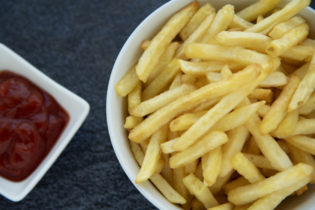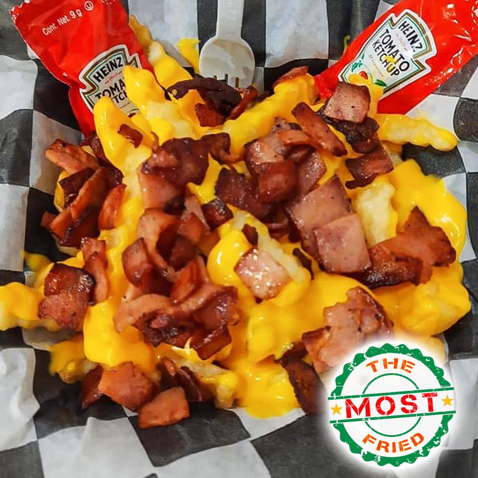 Orden de papas a la francesa con queso cheddar acompañadas de tocino