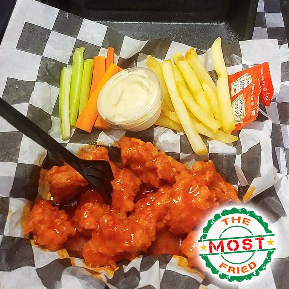 Orden (12pz de boneless) de trozos de pechuga de pollo empanizados naturales o bañados con nuestra salsa búfalo o BBQ acompañados de apio, zanahoria, papas a la francesa, aderezo blue cheese