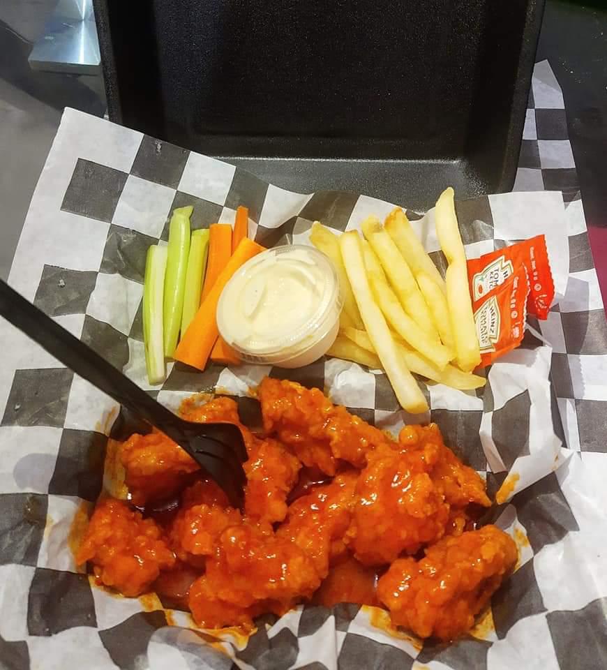 Orden de (6pz de boneless) trozos de pechuga de pollo empanizados naturales o bañados con nuestra salsa búfalo o BBQ acompañados de apio, zanahoria, papas a la francesa, aderezo blue cheese