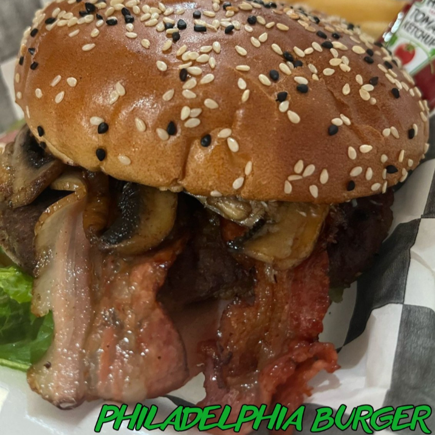 Pan, carne de arrachera, queso philadelphia, champiñones, tocino, jamon,queso asadero, cebolla morada caramelizada, guacamole, tomate, ensalada de lechugas y mayonesa.