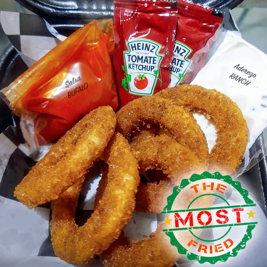 Orden de 5 Aros de cebolla con salsa de tu eleccion, aderezo ranch y catsup