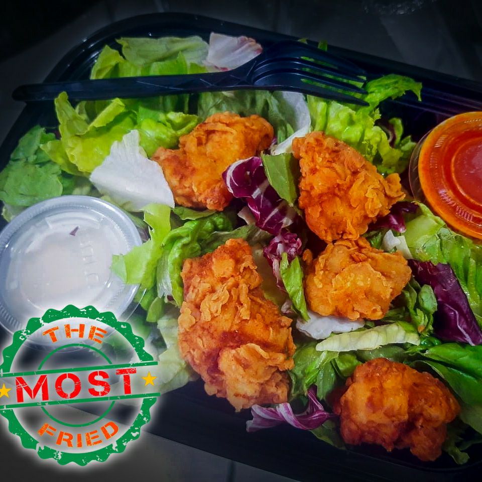 Ensalada de lechugas orgánicas, boneless con salsa de tu preferencia, zanahoria rayada, acompañada de aderezo ranch