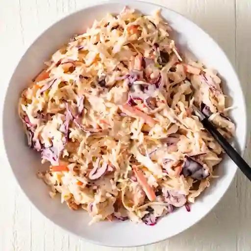 ¡Está riquísima! Ensalada de col morada, repollo y zanahoria, con mayonesa 100% casera y un toque de nuez moscada.