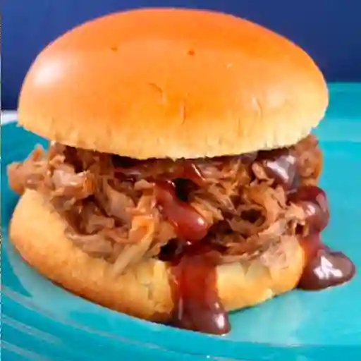 Delicioso sándwich de carne de cerdo deshebrada (150 g) con queso suizo, todo esto en medio de un exquisito pan brioche circular tostado a la perfección (incluye 2 oz de ensalada de col, pepinillos, jalapeños y salsa BBQ a escoger).