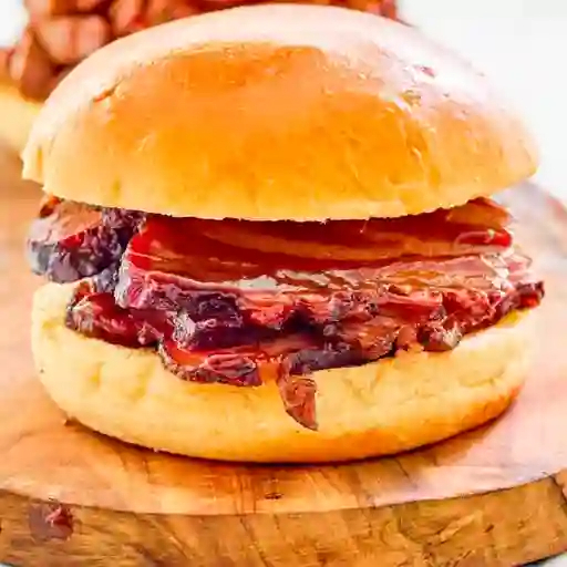 Delicioso sándwich de brisket rebanado (150 g) con queso suizo, en medio de un exquisito pan brioche circular tostado a la perfección (incluye 2 oz de ensalada de col, pepinillos, jalapeños y salsa BBQ a escoger).