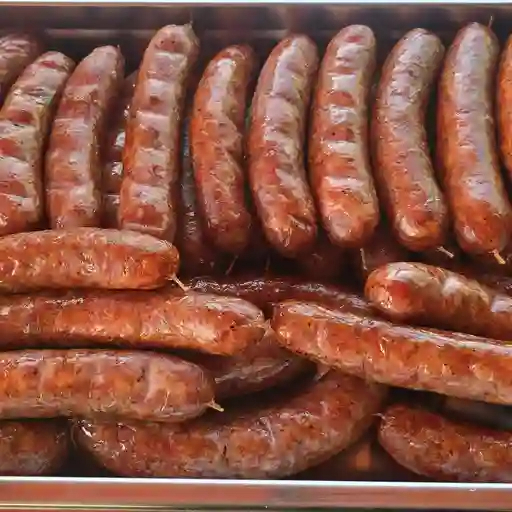¡Nuestra estrella de la casa! Salchicha hecha en casa, ahumada en leña de cerezo y nogal, 100% carne de cerdo USDA pork.