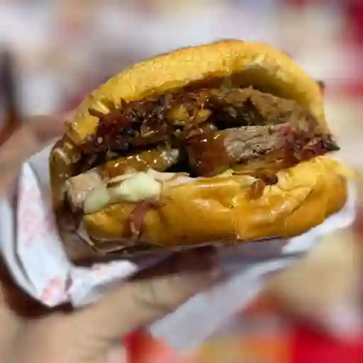Delicioso sándwich de brisket (75 g) y pulled pork (75 g) desmenuzados, con queso suizo, en medio de un exquisito pan brioche circular tostado a la perfección (incluye 2 oz de ensalada de col, pepinillos, jalapeños y salsa BBQ a escoger).