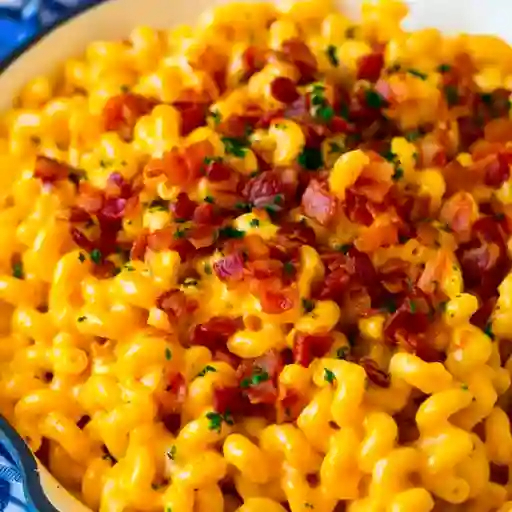 Delicioso Mac n' Cheese con queso amarillo y trocitos de tocino ahumado.