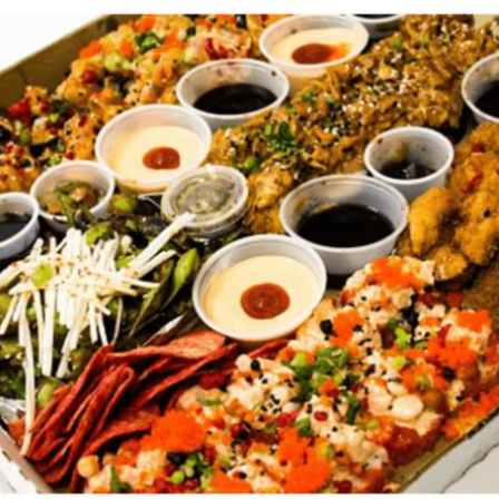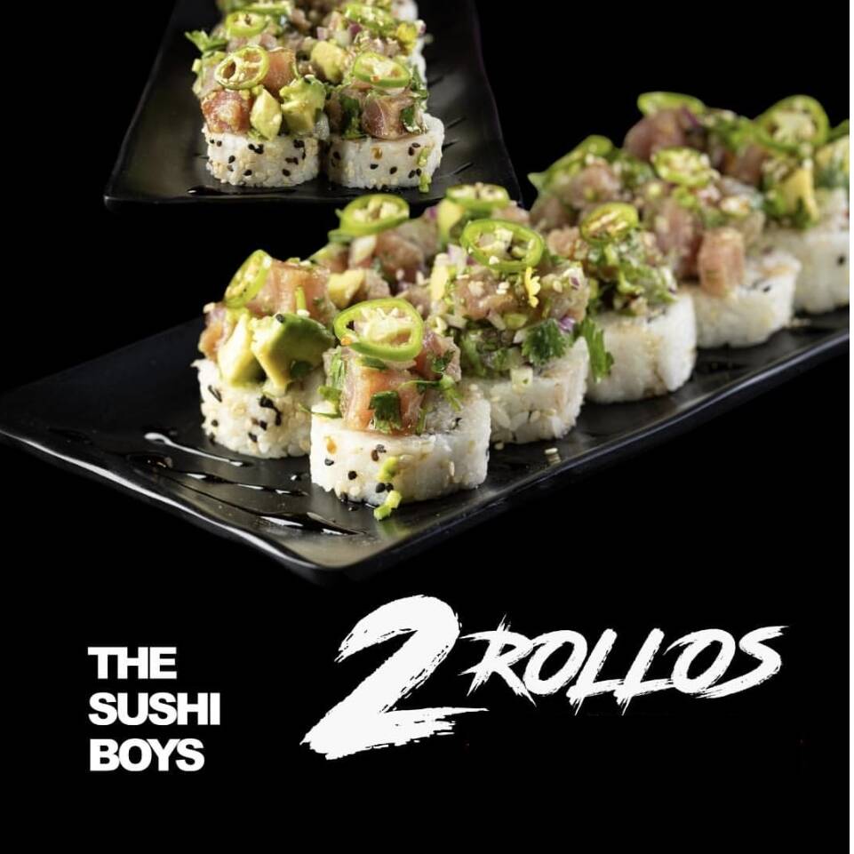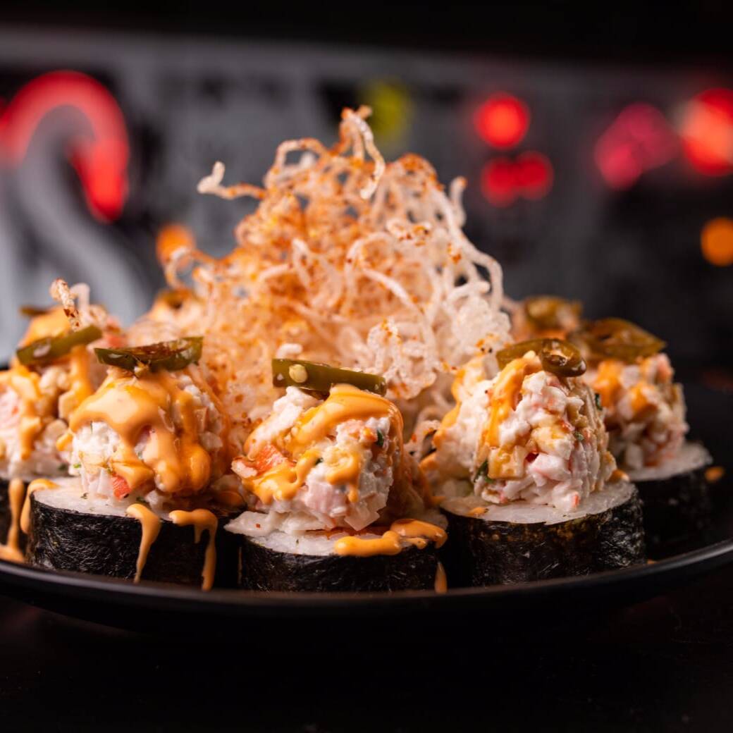 Sushi Flaming hot, Sushi Salmón Crunch, SushiTuna Hot y Sushi Rock n’ Roll, Brochetas de pollo y queso manchego, edamames salteados con soya de chile morita, aderezos spicy, salsa de anguila, chiles toreados y soya de la casa