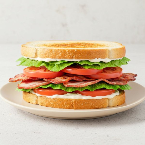 Sándwich de pan toscano con mayonesa, crujiente tocino, jitomate fresco y lechuga, creando una combinación clásica y deliciosa.