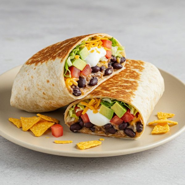 Wrap en tortilla de harina rellena de frijol negro, queso cheddar, lechuga, jitomate, aguacate en cubos, crema y salsa chipotle