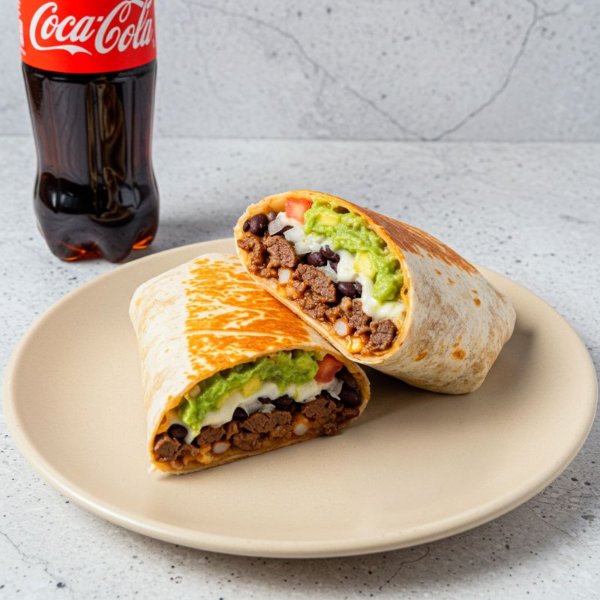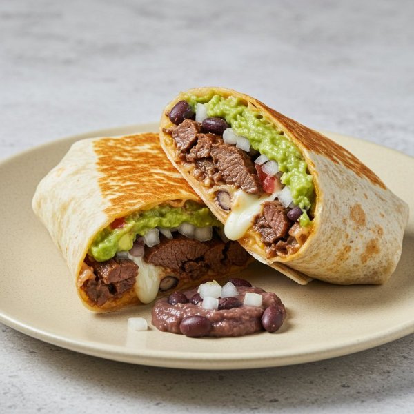 Tortilla de harina rellena de arrachera, queso mozzarella, frijoles refritos, arroz blanco, guacamole y salsa de la casa.