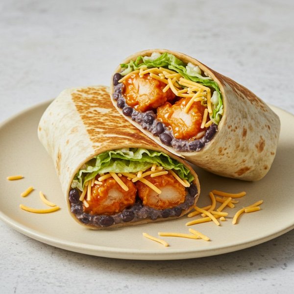 Delicioso burrito relleno de frijoles refritos lechuga queso cheddar y trozos de milanesa de pollo empanizada bañados en nuestra salsa buffalo.