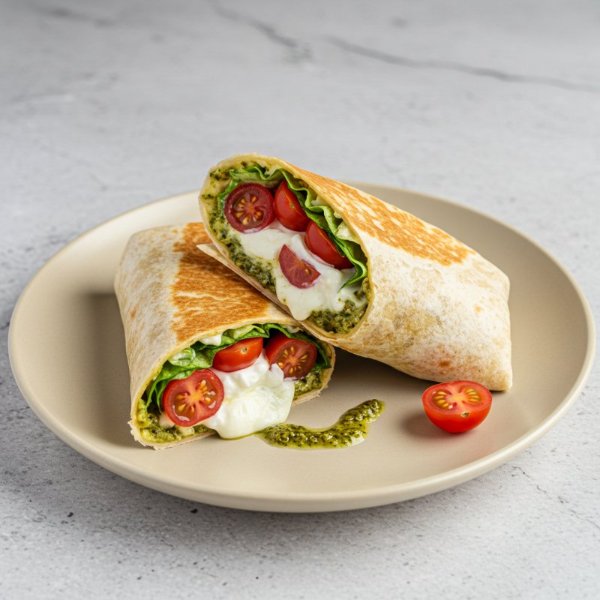 Wrap en tortilla de harina relleno con pollo finas hierbas, queso mozzarella, jitomate, lechuga, crema y pesto.