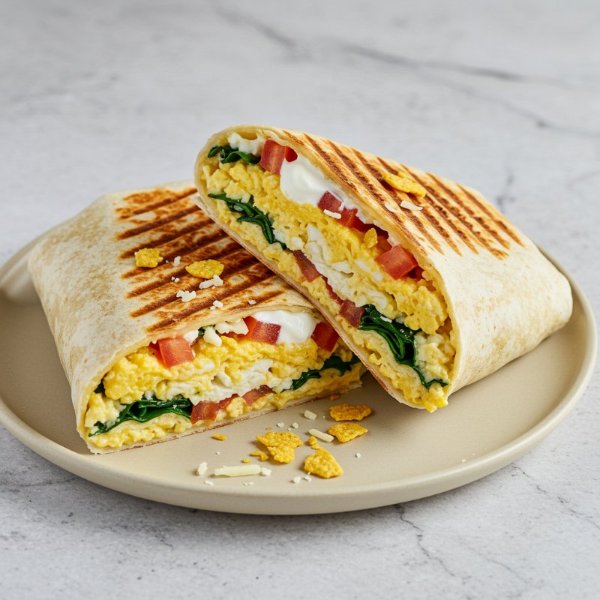 Wrap en tortilla de harina con queso mozzarella, espinaca, jitomate, queso parmesano Huevo revuelto y crema.