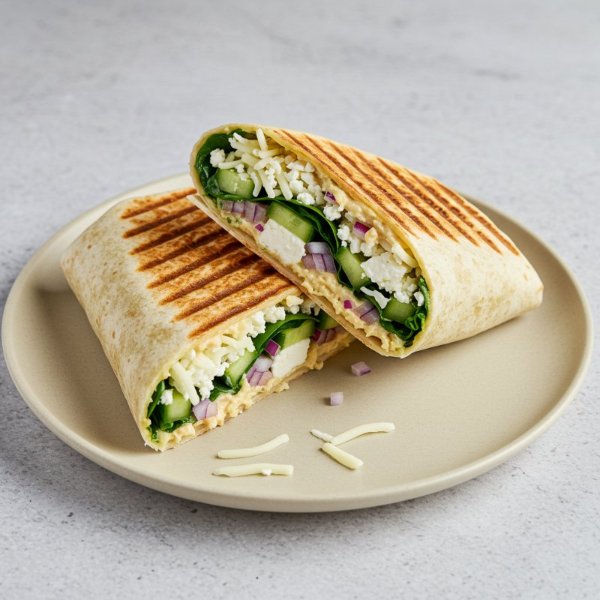 Wrap en tortilla de harina relleno con queso mozzarella, queso de cabra, pepino, cebolla morada, espinaca, hierbabuena y hummus.