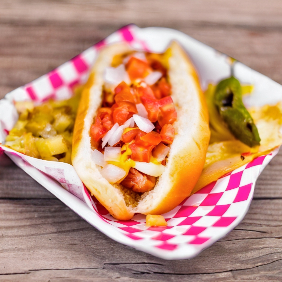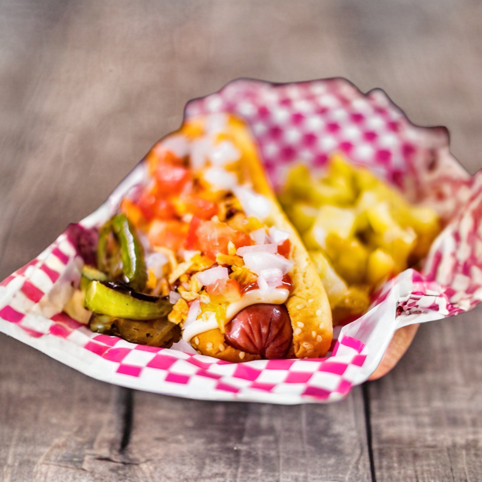 Delicioso hot dog con topping a aleccion acompañado con papa dorada, cebolla caramelizada, chile toreado, una cubierta de queso gratinado y finalizamos con peperonie
