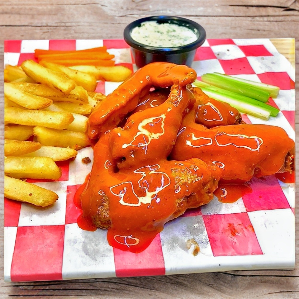 Deliciosas alitas 250gr acompañados de papas a la francesa y aderezo ranch bañado en tu salsa favorita