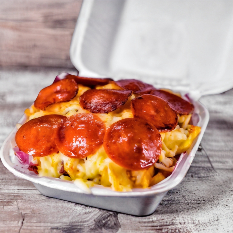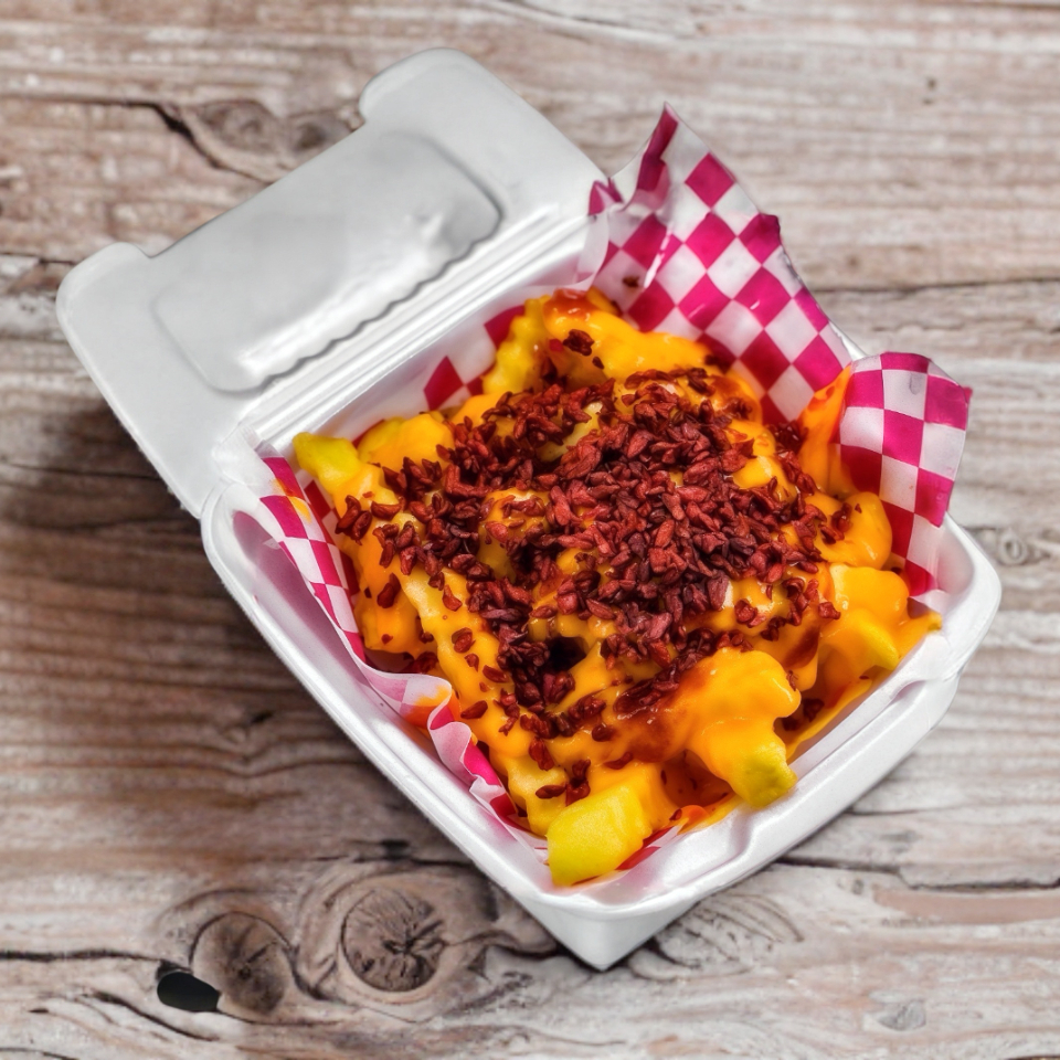 Deliciosas papas a la francesa 200gr con una cubierta de queso bien derretido, topping a eleccion y peperonie