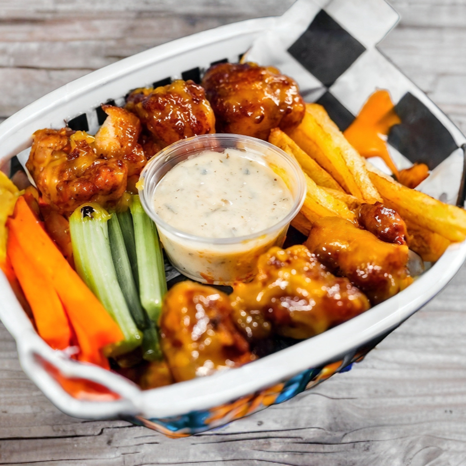 350gr de nuestras deliciosas bolitas de pechuga empanizada acompañado de aderezo ranch bañadas en tu salsa a elegir